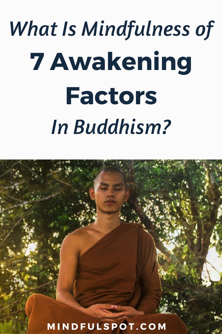 In Buddhism, mindfulness of the seven awakening factors is a part of Satipatthana Meditation that leads to Nirvana and is preceded by mindfulness of the five hindrances, mindfulness of mental states, mindfulness of feelings, mindfulness of death, mindfulness of the four elements, mindfulness of anatomical parts, mindfulness of bodily activities, and mindfulness of bodily postures. Complement with our article on the four sublime states of mind.